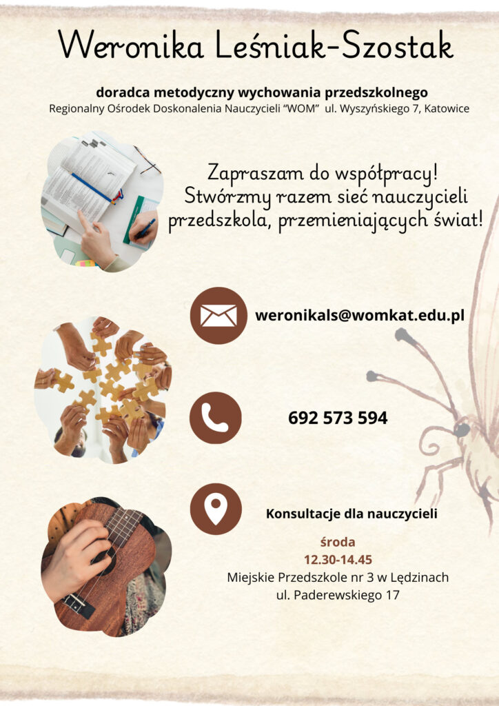 Doświadczony nauczyciel przedszkola z wieloletnim stażem, w tym z praktyką w pracy w duchu pedagogiki Montessori. Praca z dziećmi to jej pasja – z radością wspiera ich rozwój i odkrywanie świata. Prywatnie interesuje się sportem, teatrem, dobrym filmem i literaturą, co pozwala jej wprowadzać do zajęć różnorodne inspiracje i kreatywne pomysły.